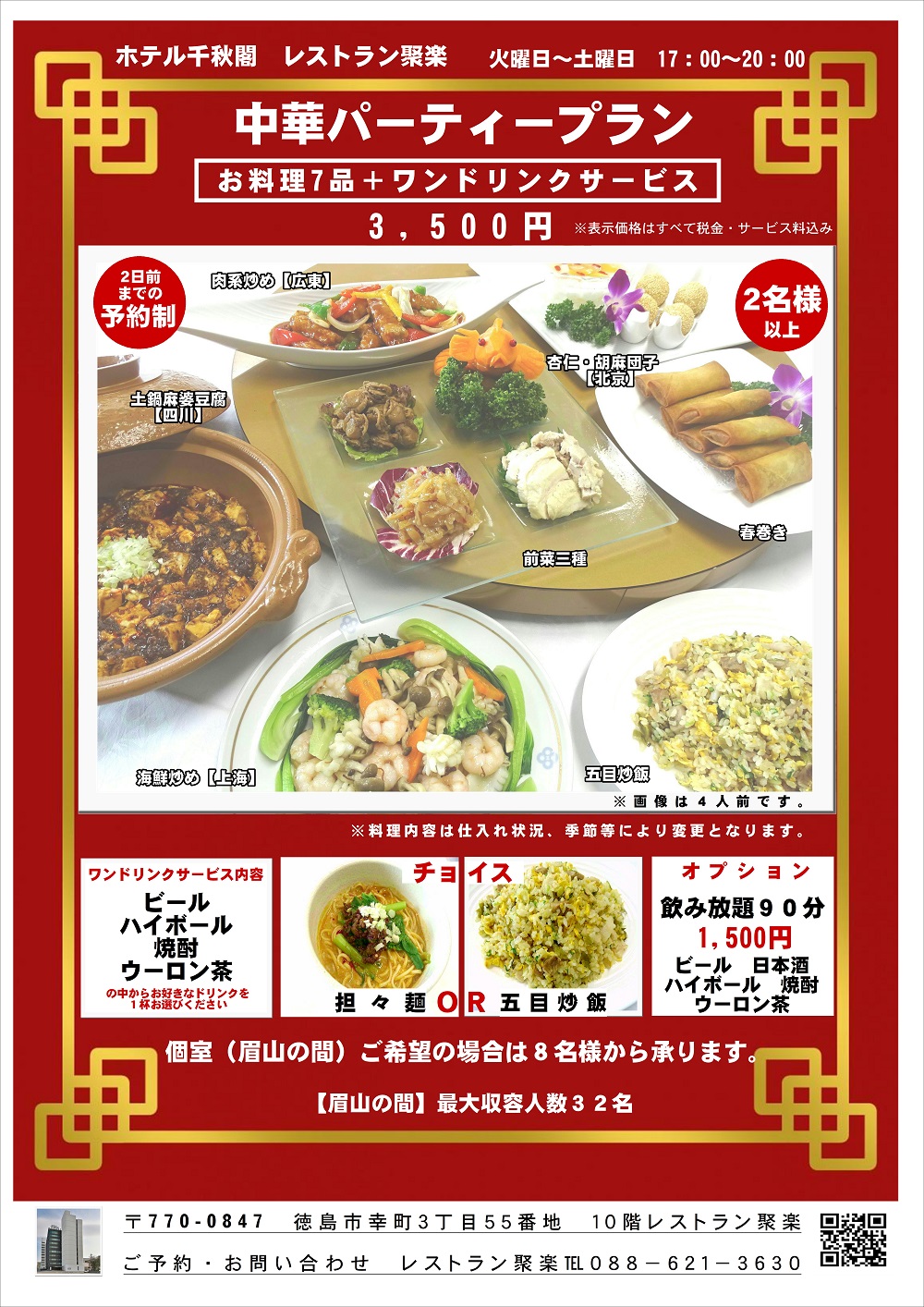 単品料理、コース料理、セット料理のメニューからお楽しみいただけます。会社の同僚、お友達同士、ご家族、カップルにも最適!夜景も美しいホテル千秋閣10階「レストラン聚楽」をご利用ください!夜景を眺めながら楽しいひとときを…。